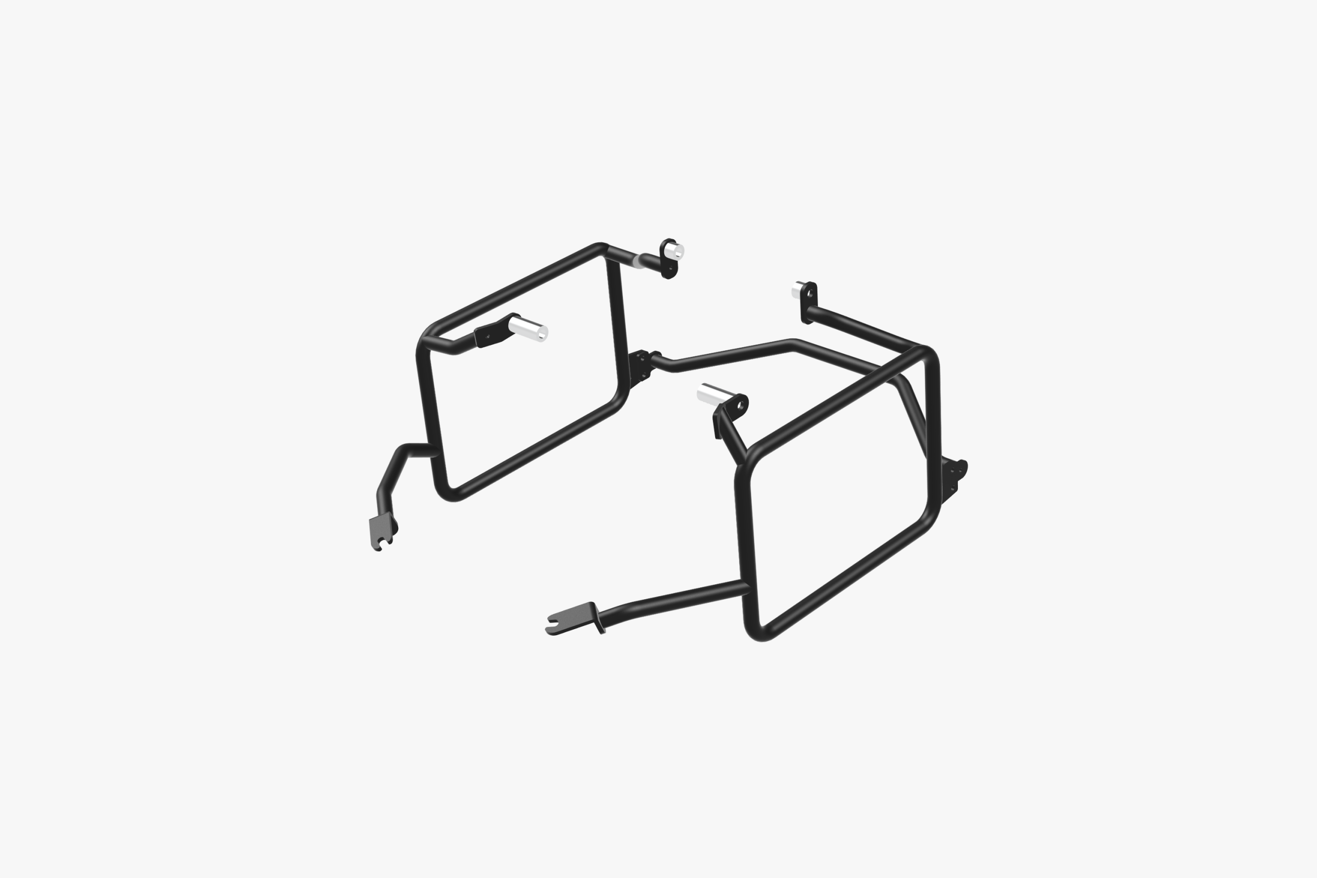 Estructuras de acero suave con recubrimiento de polvo negro mate con un soporte en X de aleación con múltiples posiciones de montaje de Rotopax para una distribución de peso personalizada, así como múltiples puntos de amarre. Incluso puedes quitar el soporte en X de sus estructuras cuando lleves Maletas Pesadas para reducir el peso de la estructura.