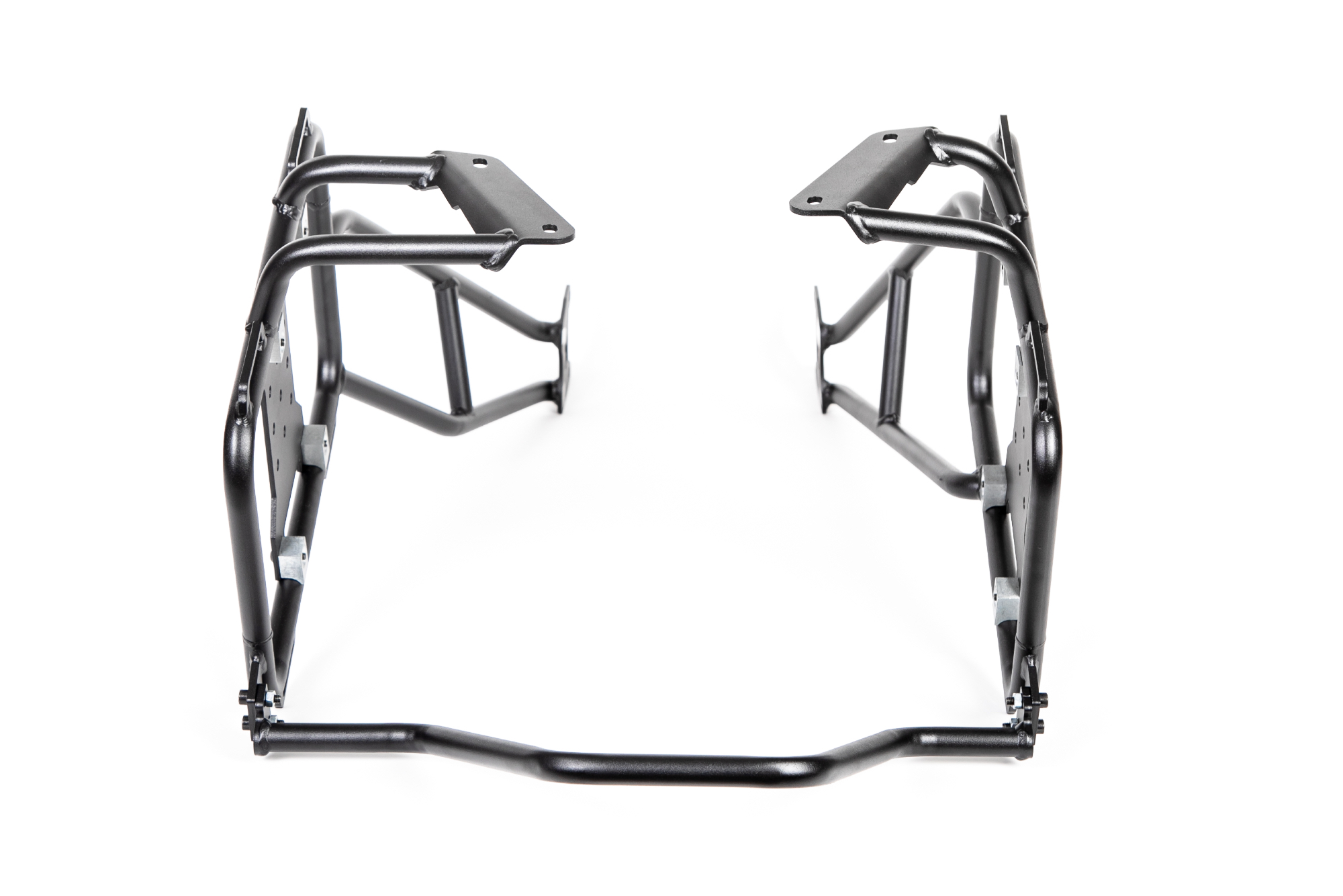 Estructuras de acero suave con recubrimiento de polvo negro mate con un soporte en X de aleación con múltiples posiciones de montaje de Rotopax para una distribución de peso personalizada, así como múltiples puntos de amarre.